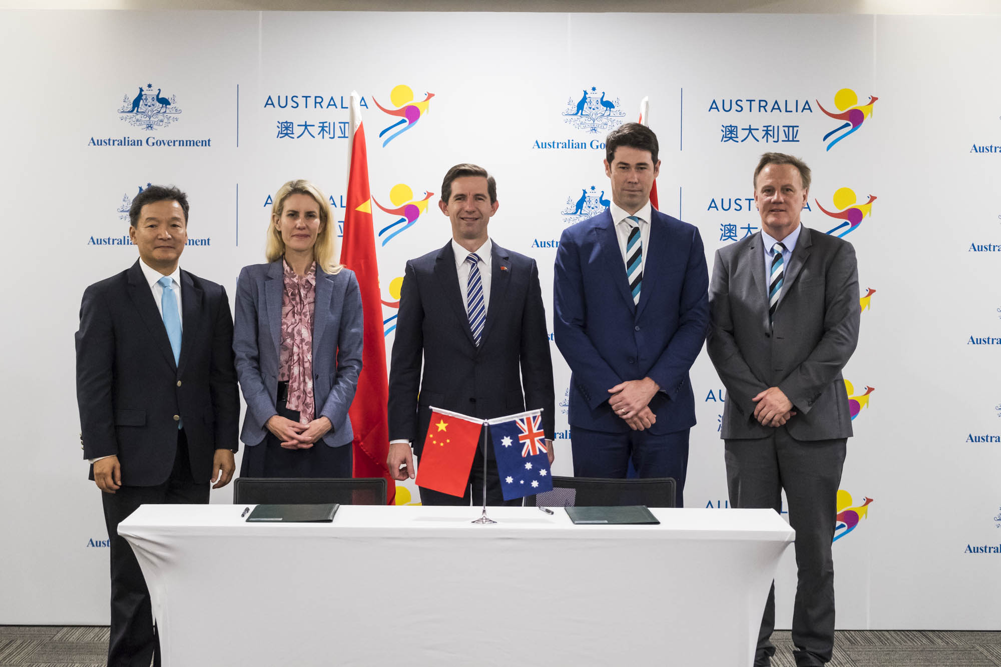 Federal Minister for Trade, Tourism & Investment Simon Birmingham witnessing the signing of the MOU between Port Adelaide and Rio Tinto. Photo credit: DFAT/Chris Crerar.