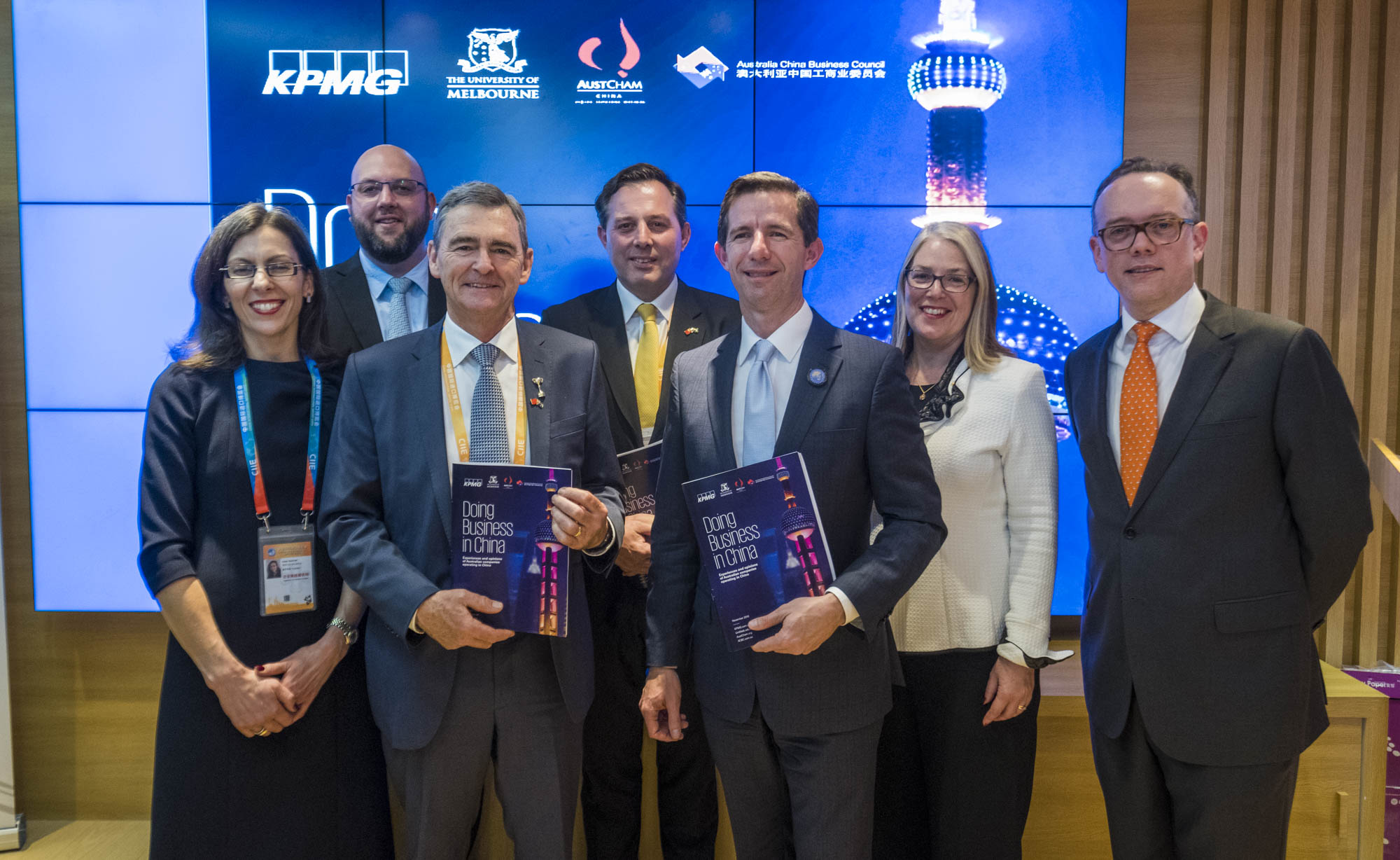 Federal Minister for Trade, Tourism & Investment Simon Birmingham with Australia-China Business Council National CEO Helen Sawczak, AustCham Beijing CEO Nick Coyle, Australia-China Council National President John Brumby, KPMG Head of Asia and International Markets Doug Ferguson, Australian Ambassador to China Jan Adams, and KPMG Global Chair, Global China Practice and AustCham Beijing Chair Vaughn Barber. Photo credit: DFAT/Chris Crerar.