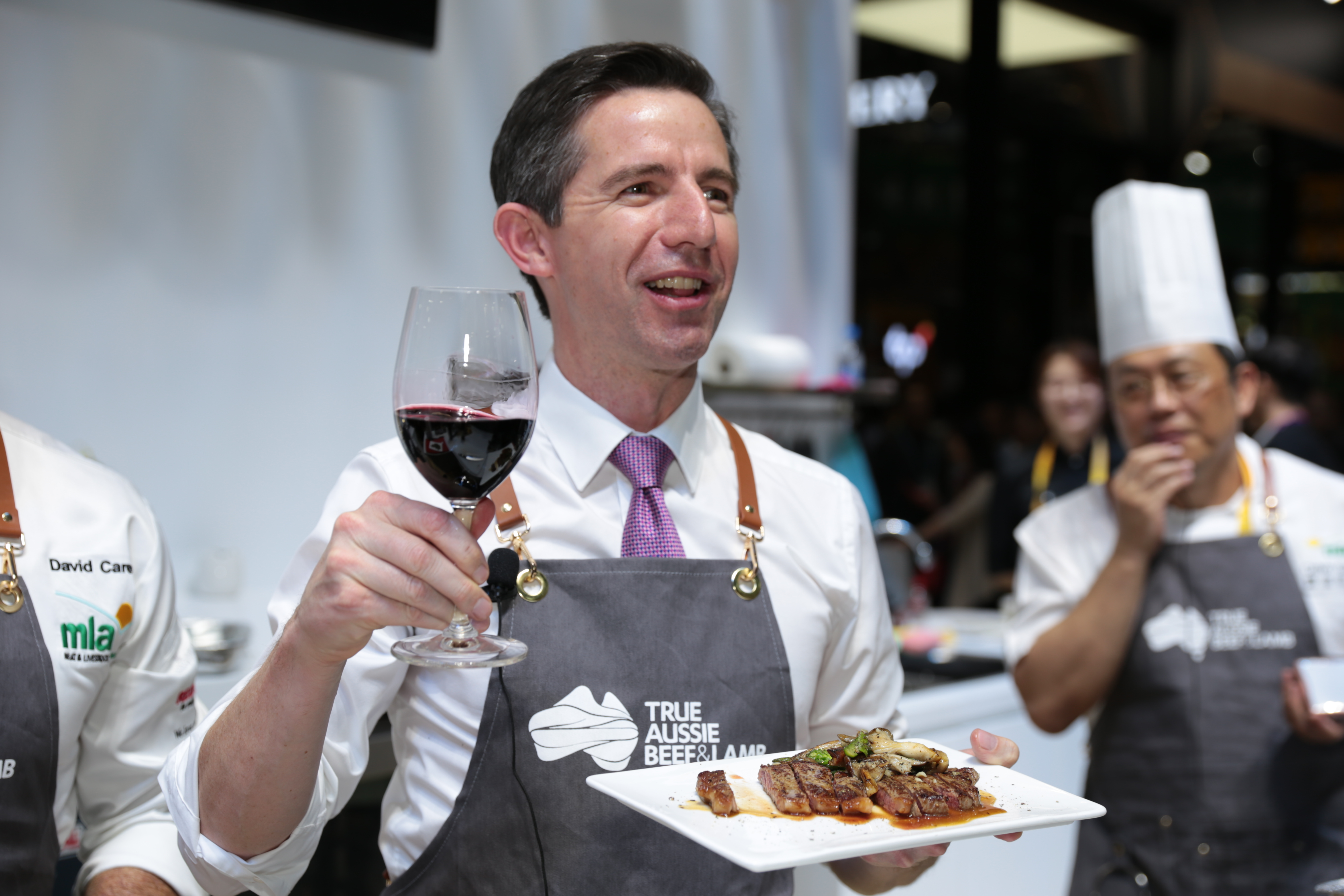Trade, Tourism and Investment Minister Simon Birmingham participates in a cooking demonstration alongside MLA Chef David Carew at the Australia Pavilion at the 2019 CIIE in Shanghai. Photo credit: DFAT/Luke Pegrum.