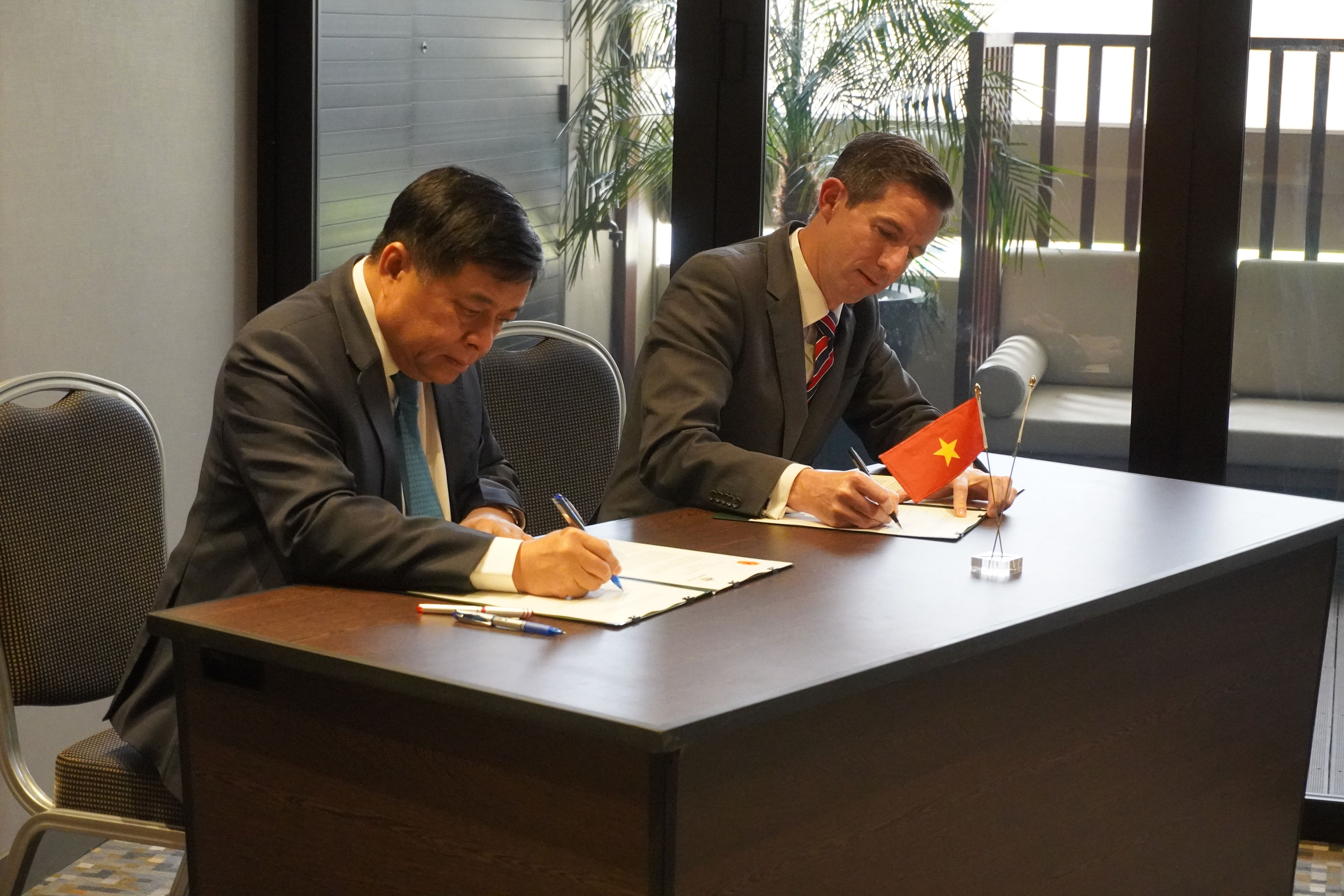 Minister for Planning and Investment Dung with TTI Simon Birmingham signing the Australia Vietnam Economic Partnership. Photo Credit: DFAT.