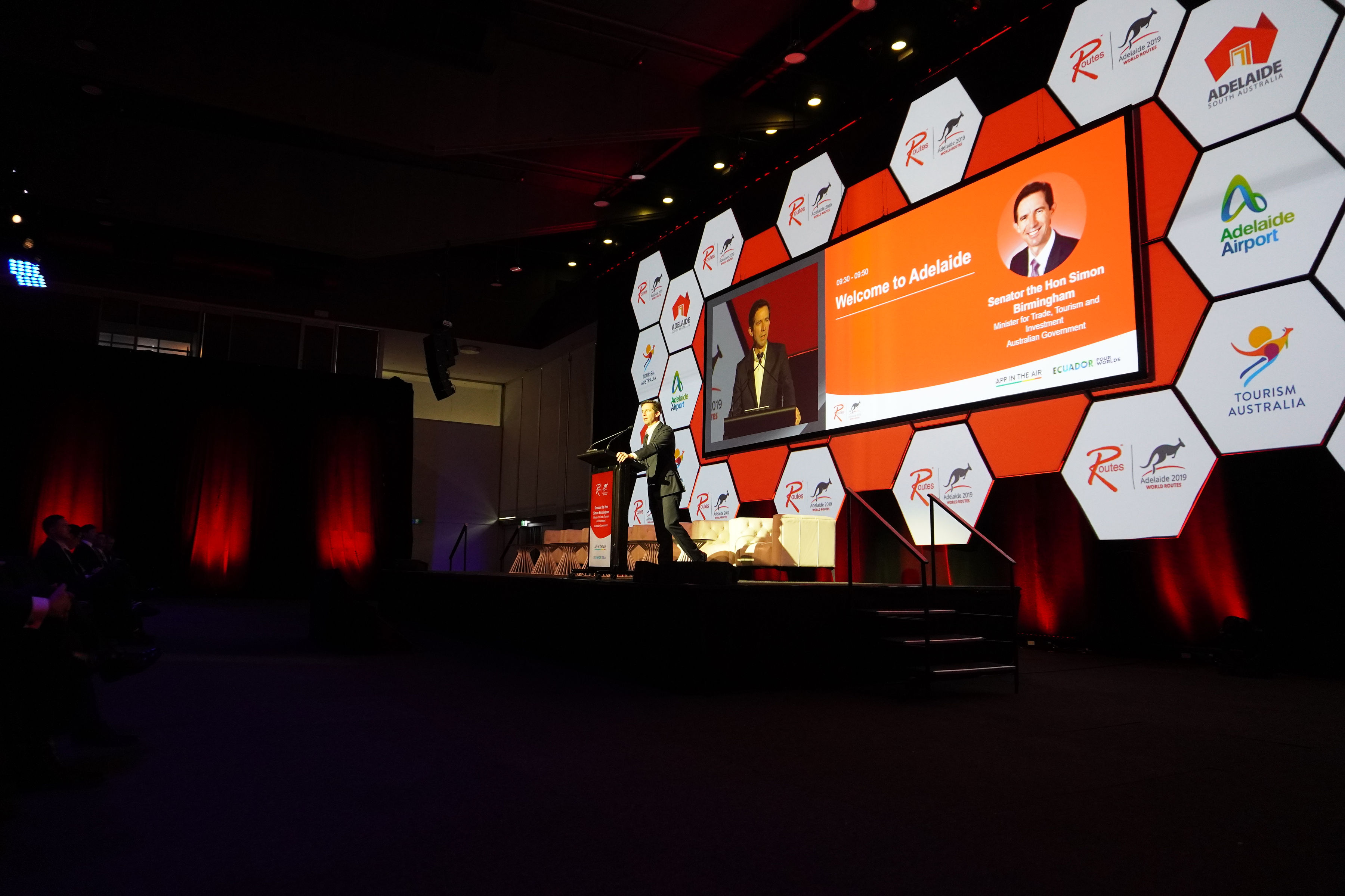 TTI Minister Simon Birmingham addressing the World Routes Conference in Adelaide, South Australia. Photo Credit: TTIMO.