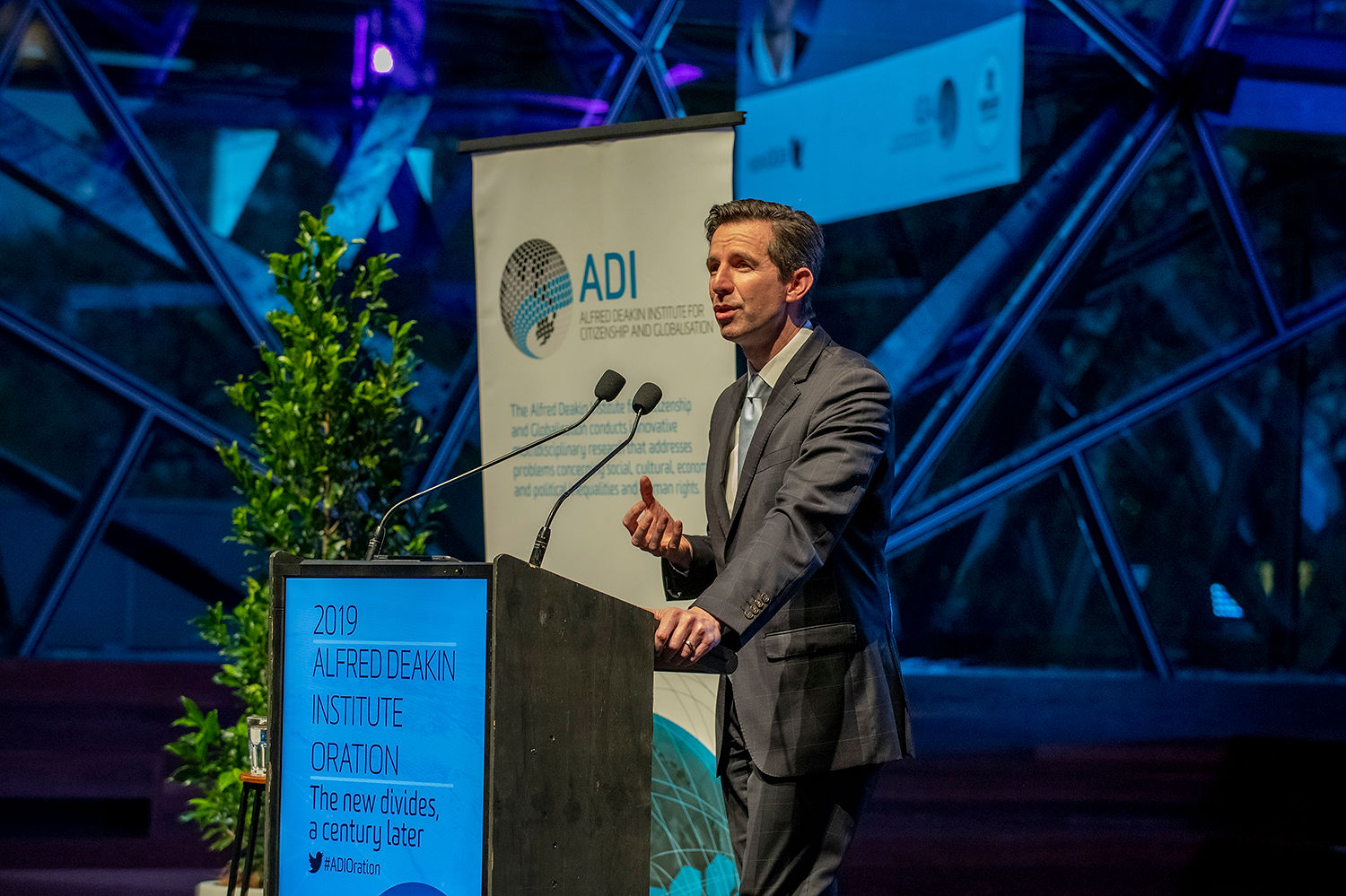 TTI Minister Birmingham delivering the 2019 Alfred Deakin Institute Oration. Photo Credit: Deakin University.