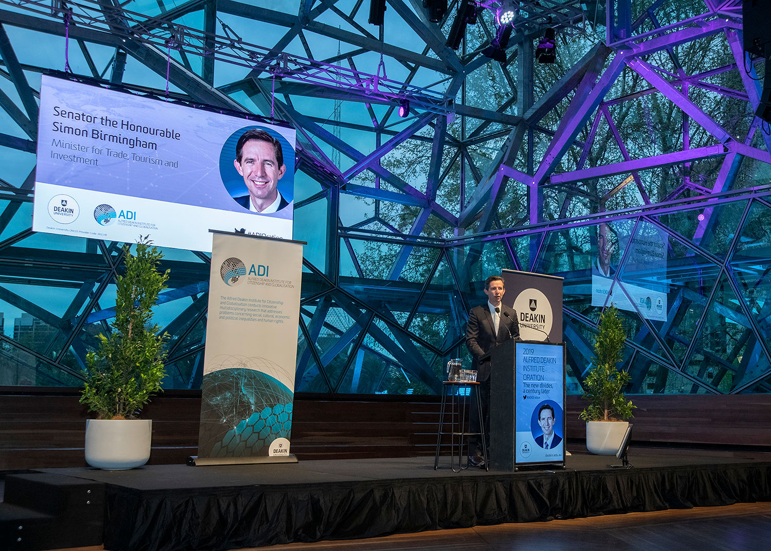 TTI Minister Birmingham delivering the 2019 Alfred Deakin Institute Oration. Photo Credit: Deakin University.