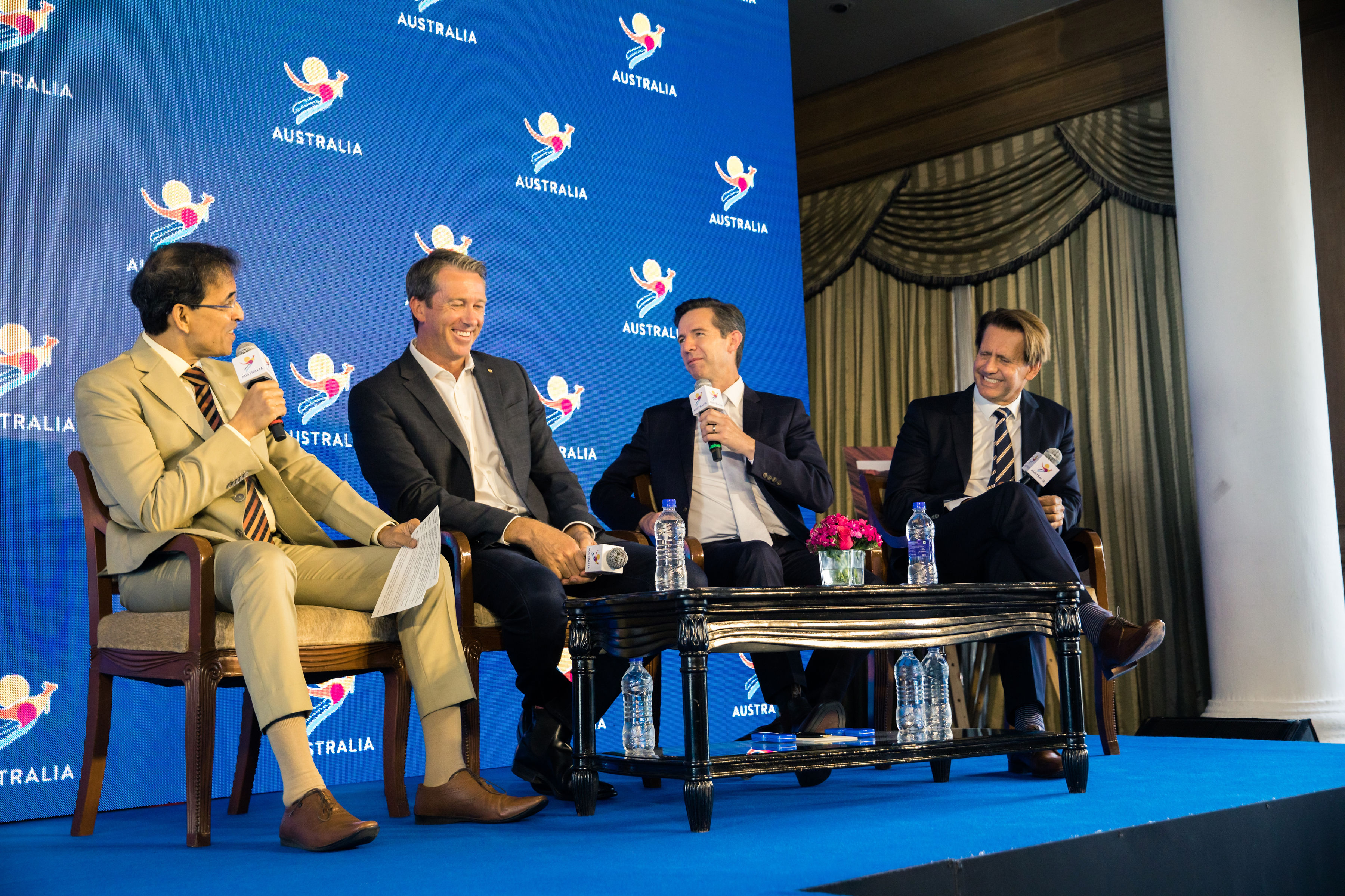 TTI Minister Simon Birmingham speaking on Australian Tourism and the T20 World Cup with cricket commentator Harsha Bhogle, Glenn McGrath and Tourism Australia Board Chairman Bob East. Photo Credit: DFAT.