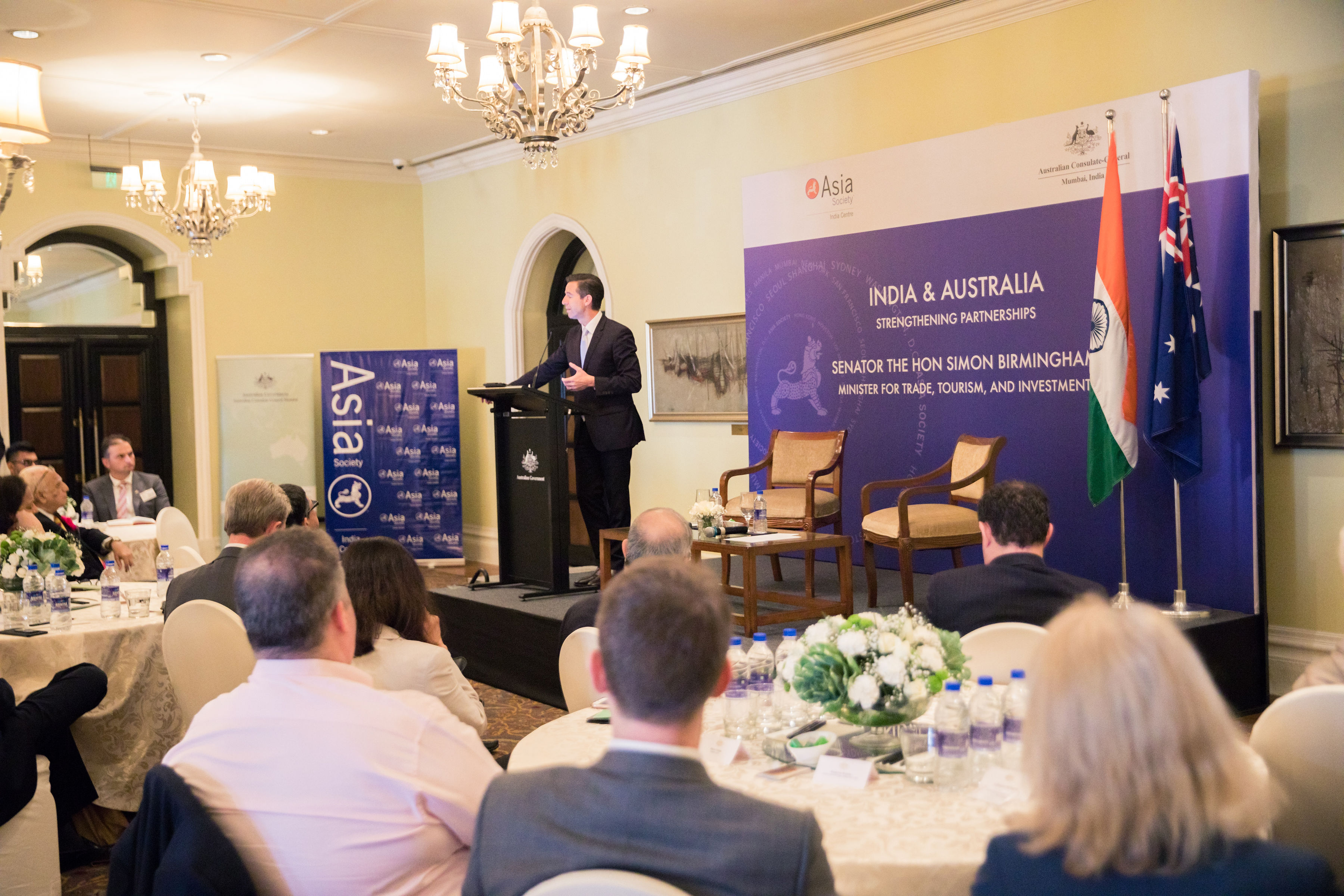 TTI Minister Simon Birmingham delivering a keynote address to the Asia Society, Mumbai. Photo Credit: DFAT.