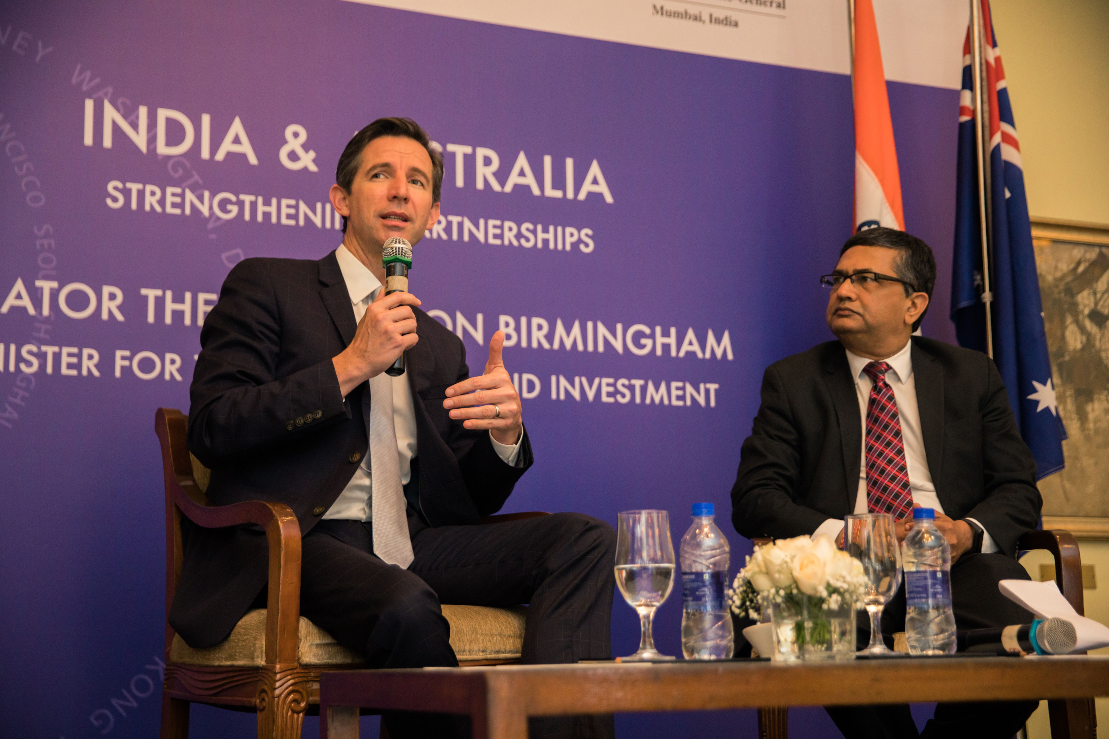 TTI Minister Simon Birmingham answering Q&A with the Asia Society, Mumbai. Photo Credit: DFAT.