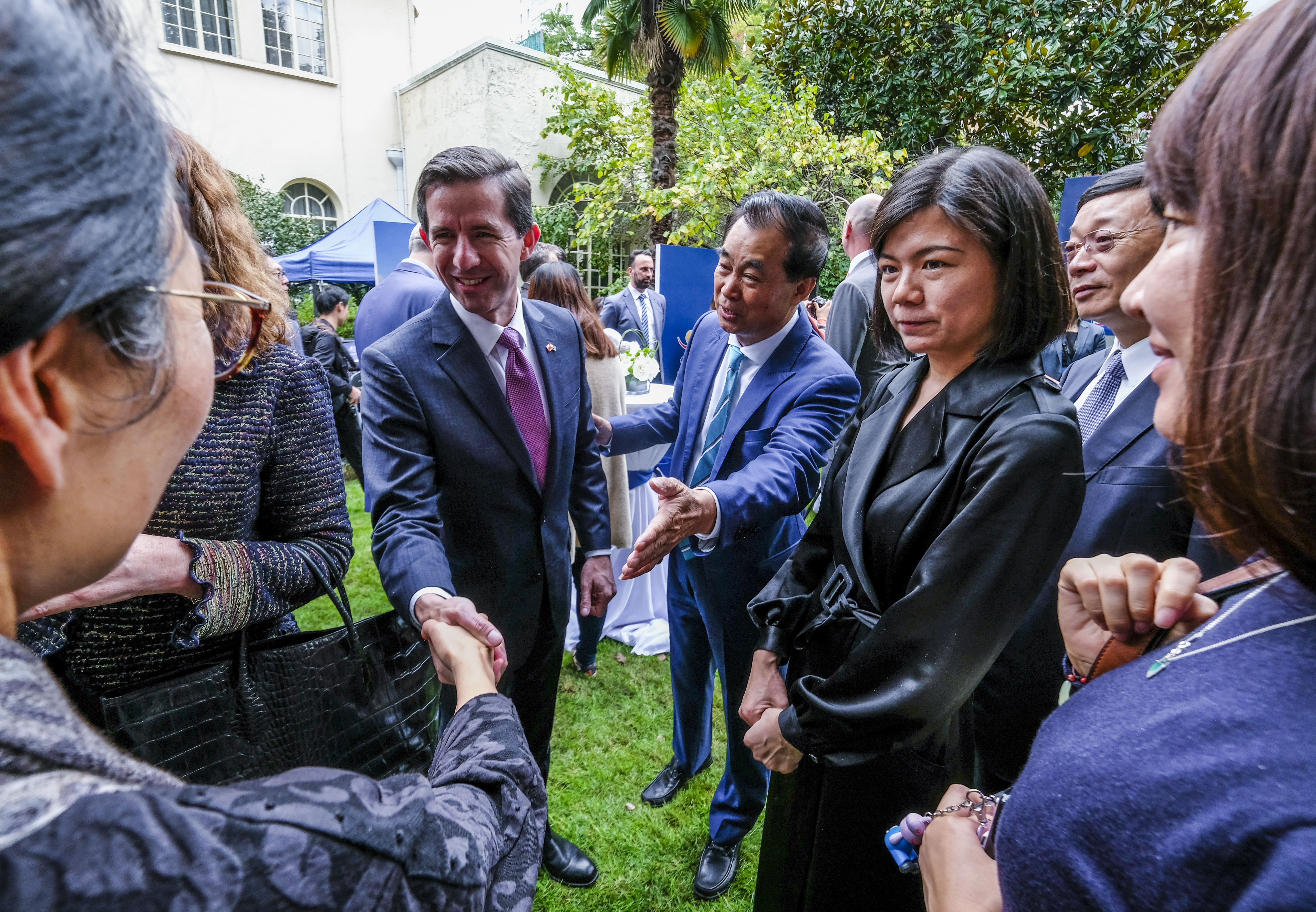 Federal Minister for Trade, Tourism & Investment Simon Birmingham is introduced to guests by Shanghai Cred's Chairman Gui Guojie at the Australian Consulate during an AFL China press call. Photo credit: DFAT/Chris Crerar.