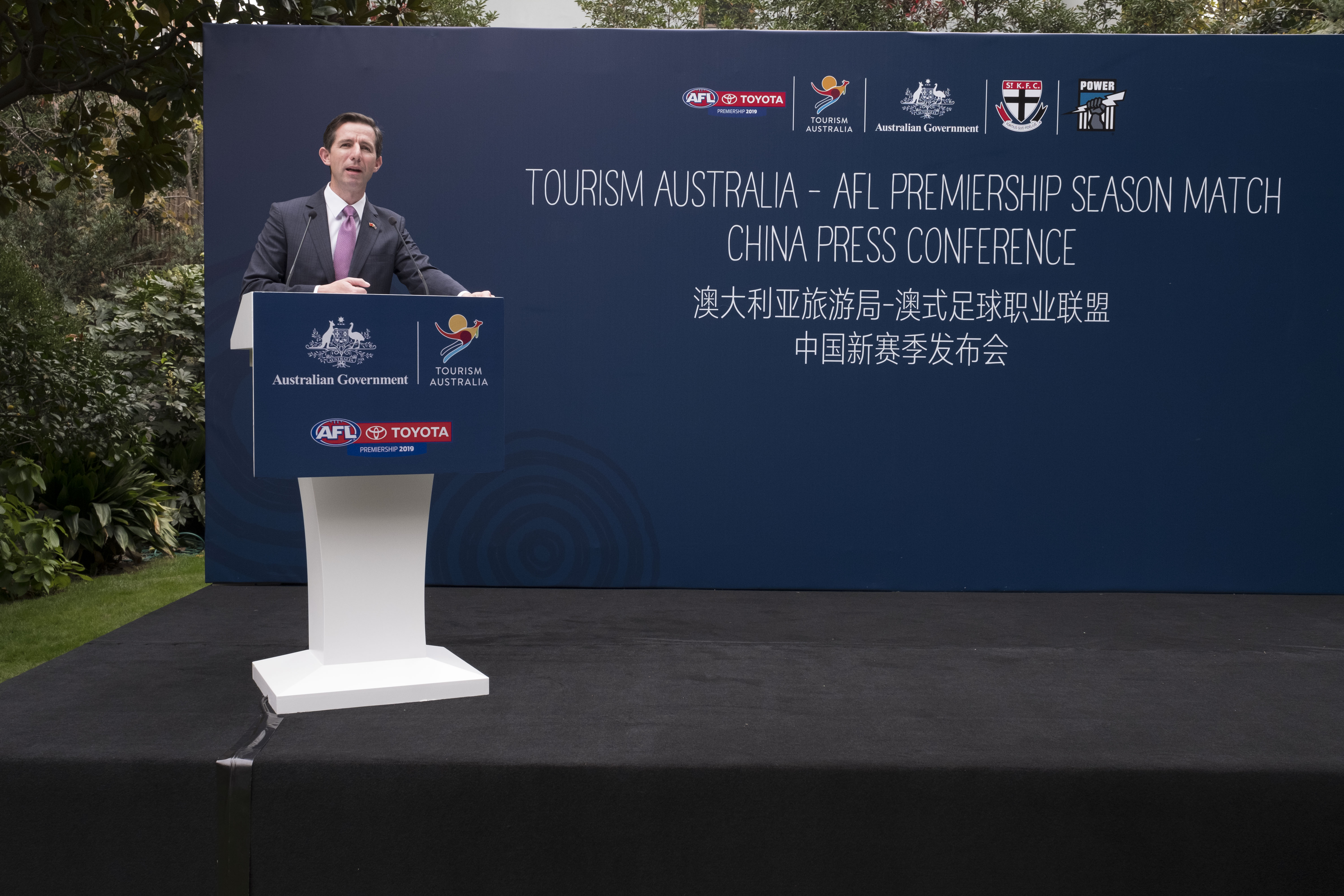 Federal Minister for Trade, Tourism & Investment Simon Birmingham speaking at the Australian Consulate in Shanghai during an AFL China press call. Photo credit: DFAT/Chris Crerar.