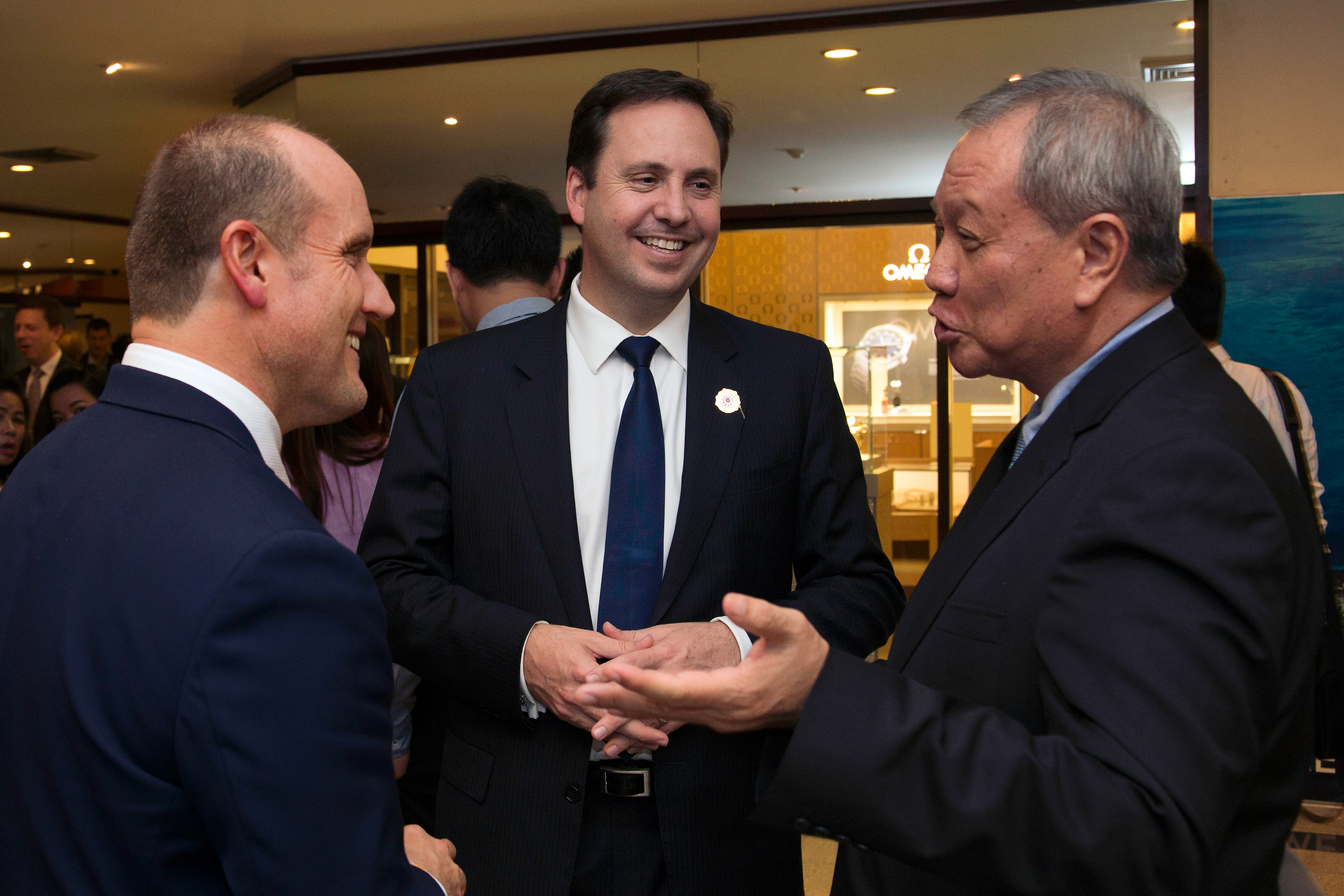 Minister for Trade, Tourism and Investment Steven Ciobo and Australian Ambassador to Laos John Williams (L) with Mr Oudet Souvannavong, President of the Lao National Chamber of Commerce and Industry, at an Australian Chamber of Commerce business dinner. Vientiane, Laos. 4 August 2016. Photo credit: DFAT/Bart Verweij