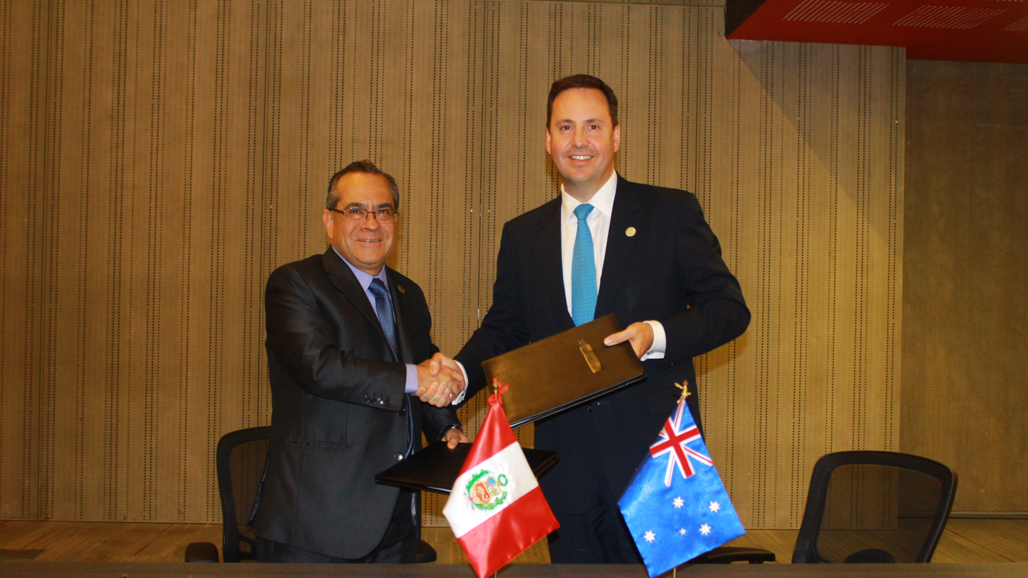 Minister for Trade, Tourism and Investment, Steven Ciobo and Peruvian Minister for Education, Jaime Saavedra signing a MOU on Education with Peru. Credit: DFAT