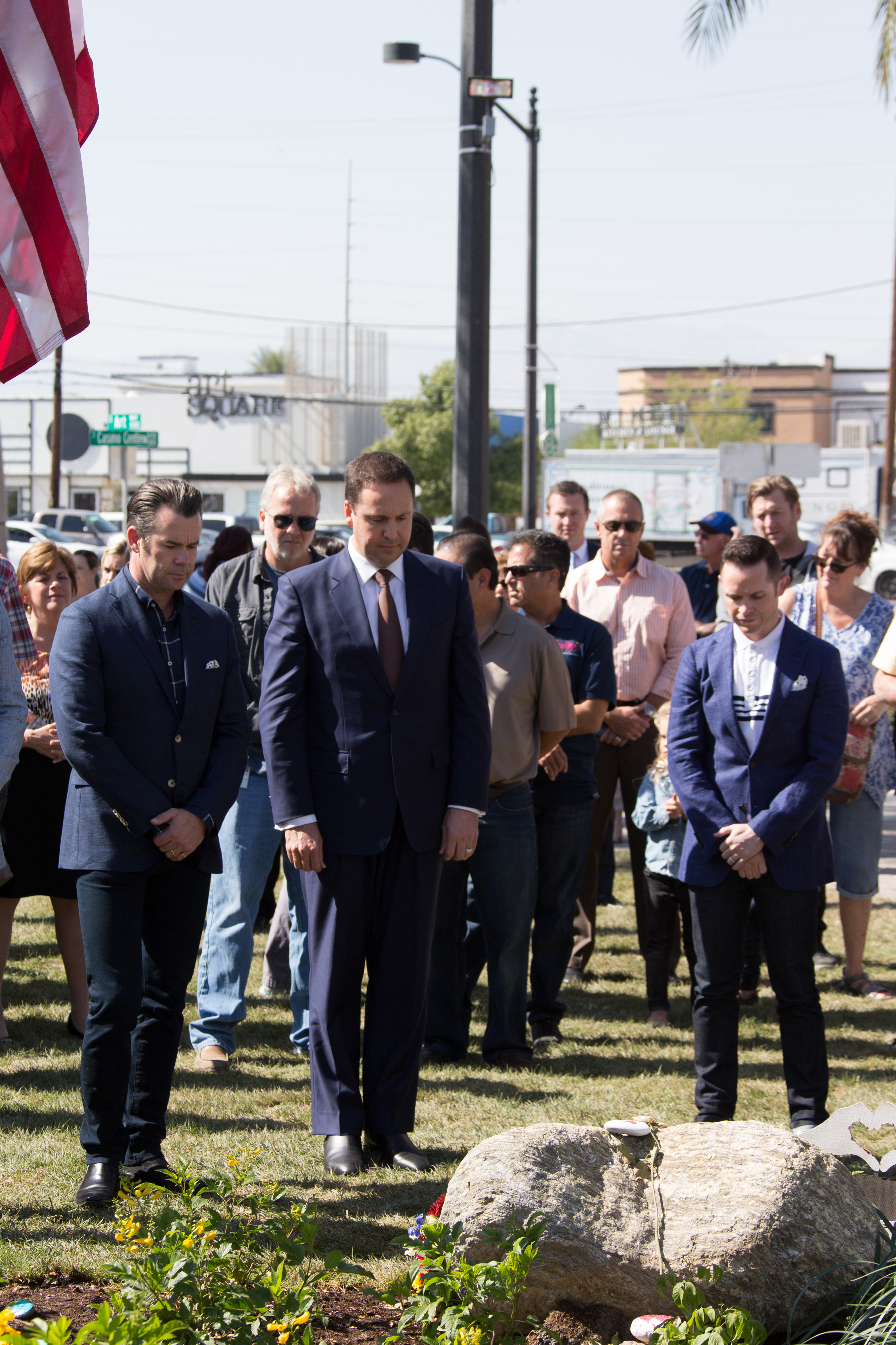 Trade, Tourism and Investment Minister Steven Ciobo and Australian band Human Nature pay their respects at the Las Vegas Community Healing Garden, Thursday 12 October 2017.