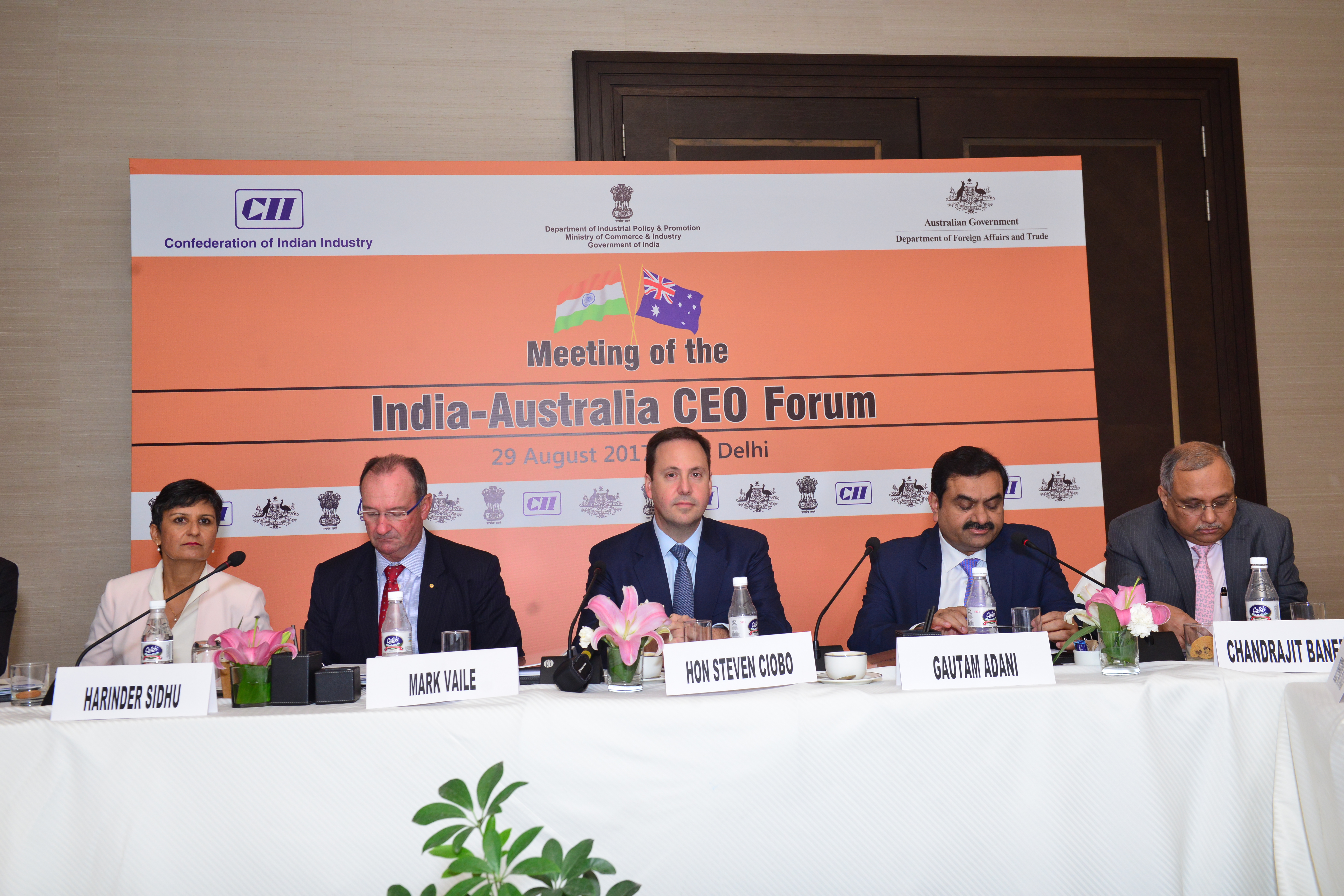 From L to R: Her Excellency Ms Harinder Sidhu, High Commissioner to India, Mr Mark Vaile, Chair, Whitehaven Coal Ltd and CEO Forum Co-Chair; Minister for Trade, Tourism and Investment, the Hon Steven Ciobo MP; Mr Gautam Adani, Chair, Adani Group and CEO Forum Co-Chair; and Mr Chandrajit Banerjee, Director General, Confederation of Indian Industry.