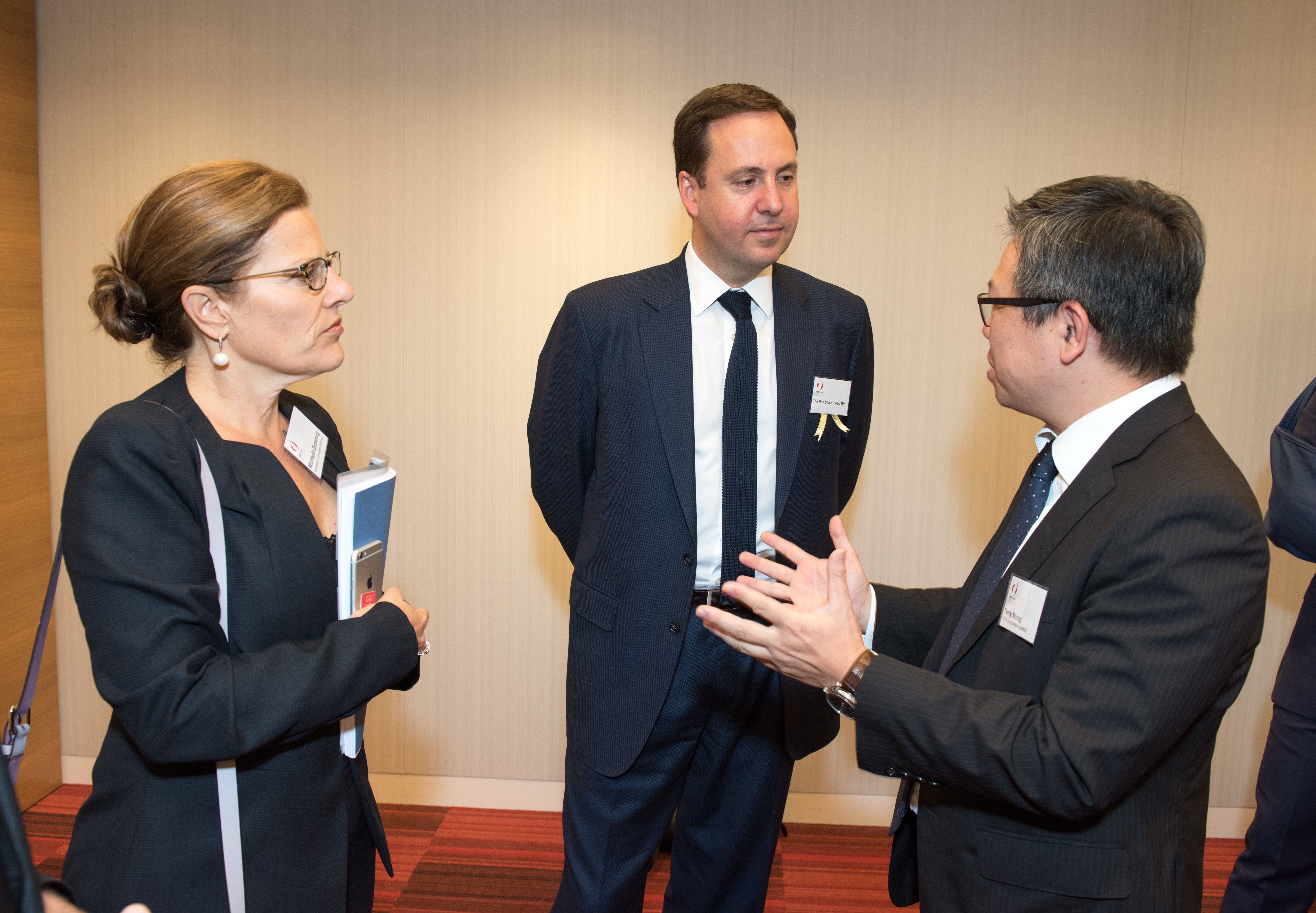 Trade, Tourism and Investment Minister Steven Ciobo talking with Australian Consul-General to Hong Kong Michaela Browning and MTR Corporation Ltd’s Head of Australian Business Terry Wong at meeting with AustCham Board and Platinum Members in Hong Kong.