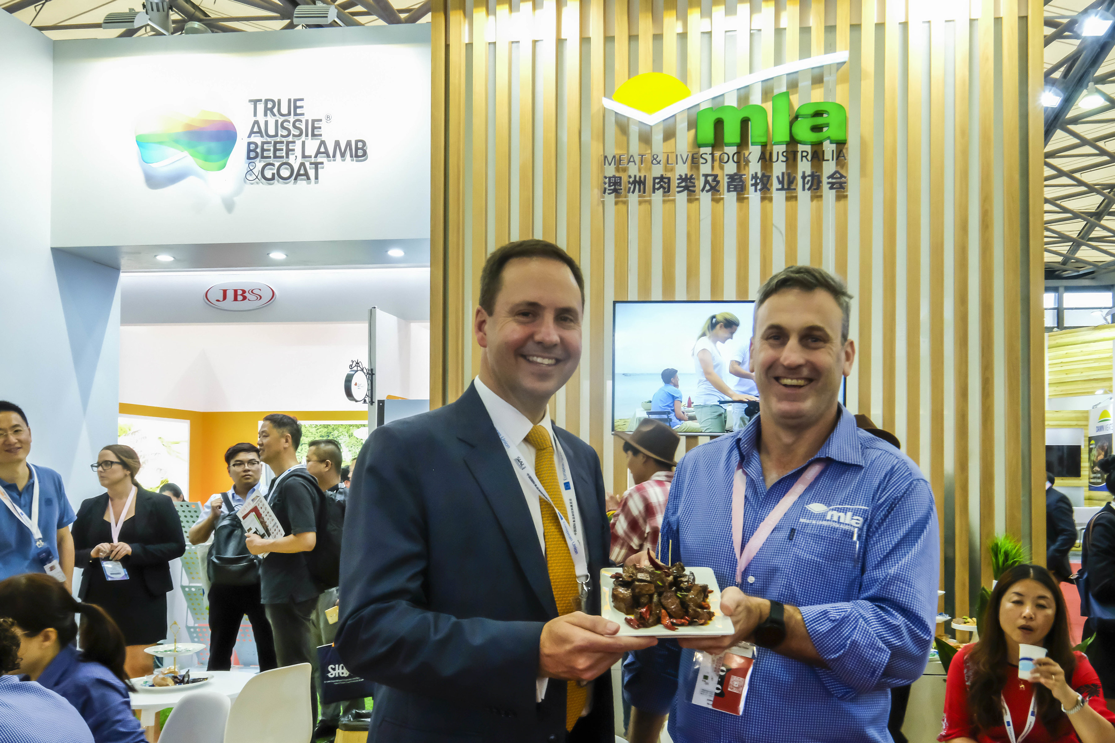 Federal Minister for Trade, Tourism & Investment Steven Ciobo at the Shanghai SIAL Food Industry Expo trying Australian beef with the MLA's GM Michael Finucan.