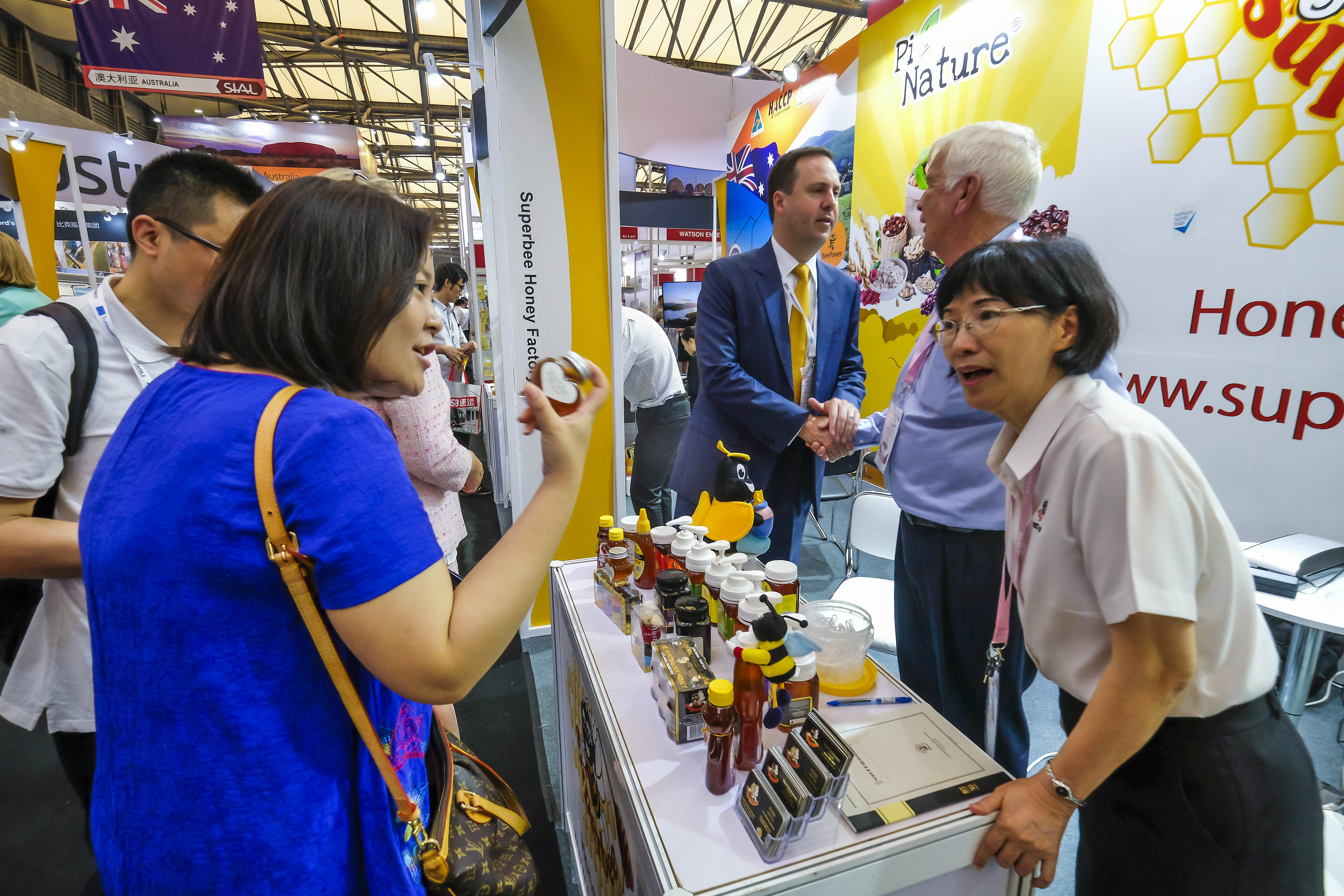 Federal Minister for Trade, Tourism & Investment Steven Ciobo at the Shanghai SIAL Food Industry Expo shakes hands with the Director of Superbee Honey Factory, Ross Christiansen, at the Australian Pavillion.