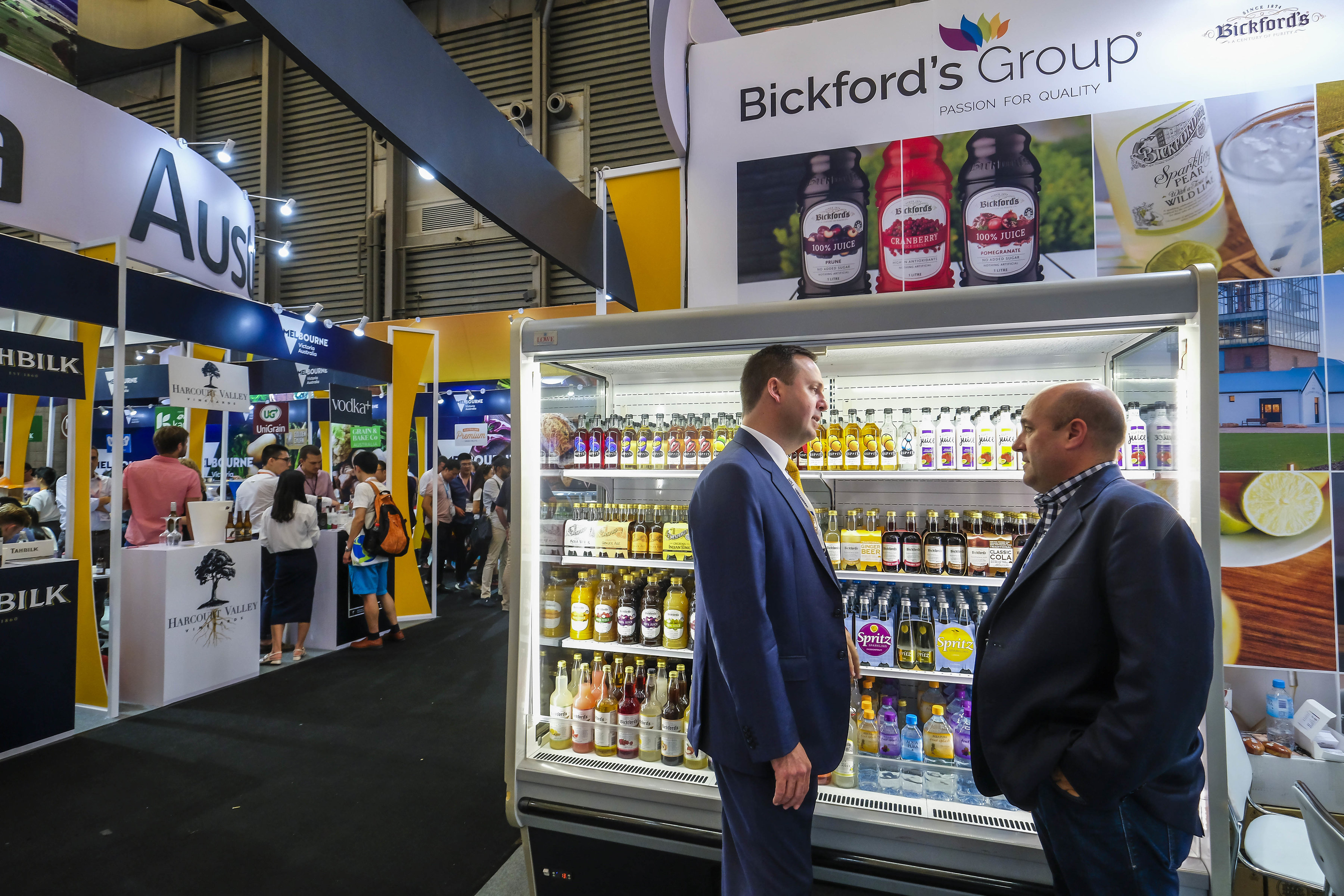 Federal Minister for Trade, Tourism & Investment Steven Ciobo at the Shanghai SIAL Food Industry Expo the International Sales Manager of the Bickford's Group, Simon Sparrow, at the Australian Pavillion.