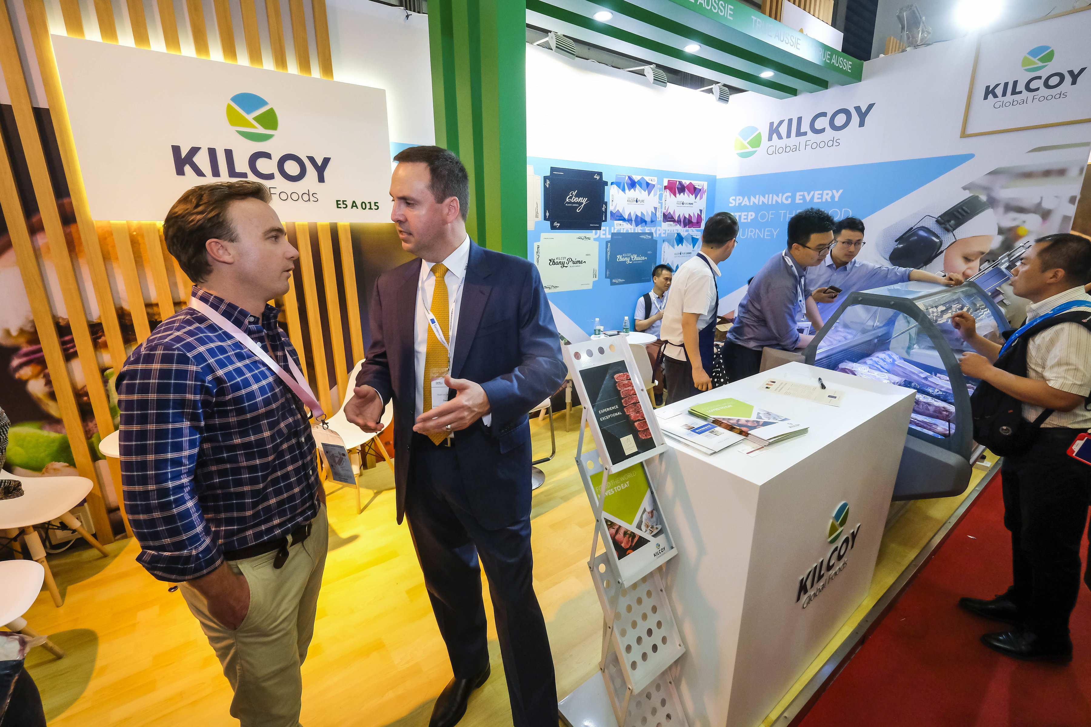 Federal Minister for Trade, Tourism & Investment Steven Ciobo at the Shanghai SIAL Food Industry Expo talking with Killcoy GM of livestock Craig Price .