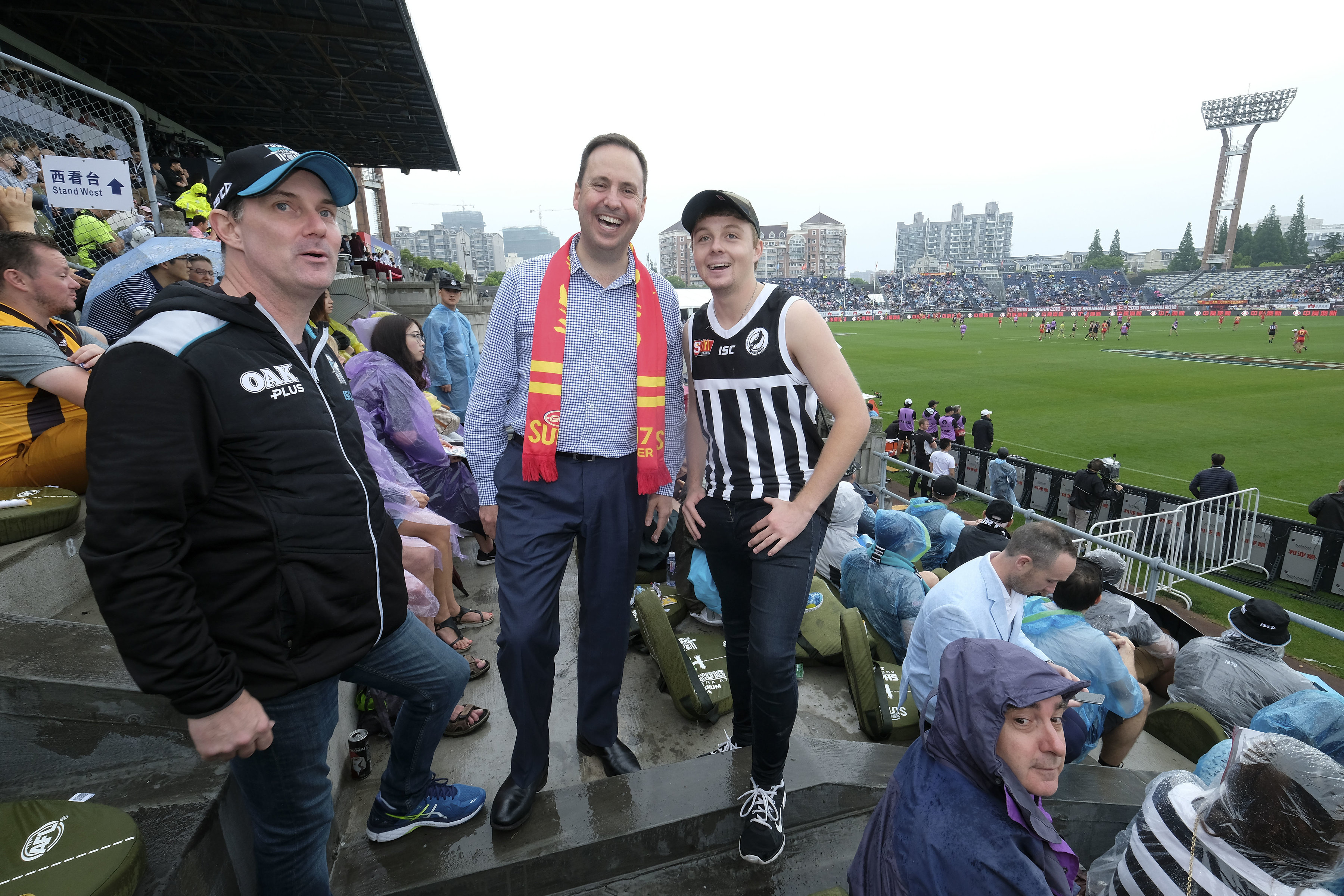 Federal Minister for Trade, Tourism & Investment Steven Ciobo at the AFL match in Shanghai with Port Adelaide fans (L) Robert Blackborough and Senna Blackborough.