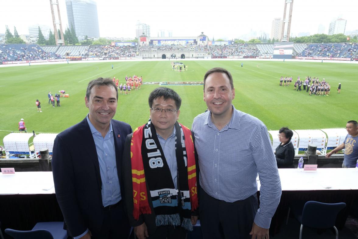 Federal Minister for Trade, Tourism & Investment Steven Ciobo at the AFL match in Shanghai with from left: SA Premier Stephen Marshall, Shanghai Vice Mayor Professor Chen Qun.