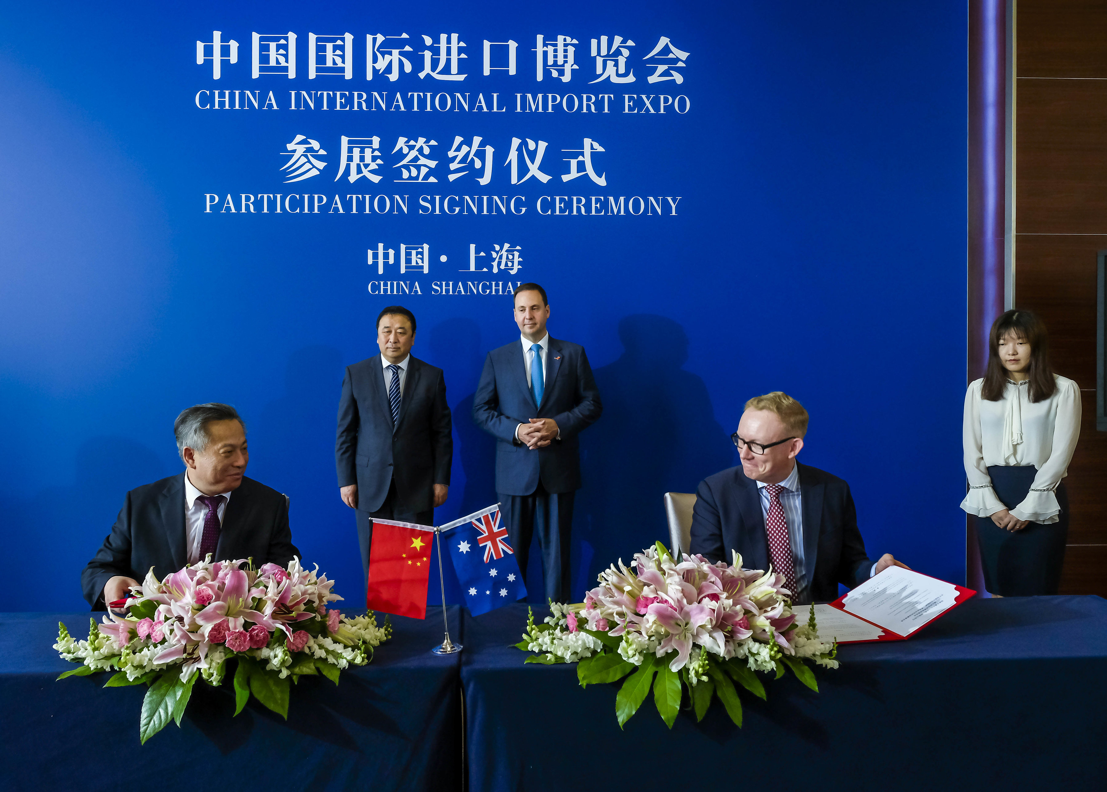 Federal Minister for Trade, Tourism & Investment Steven Ciobo witnessing the signing of the MOU with Mr Sun Chenghai (Chairman, CIIE Bureau) by Mr LIU Fuxue (Dep Dirsector-General NECC) and the Deputy CEO of AUSTRADE David Hazlehurst at the National Exhibition & Convention Centre in Shanghai, where an MOU was to formalise Australia's participation in the China International Import Expo in November 2018.