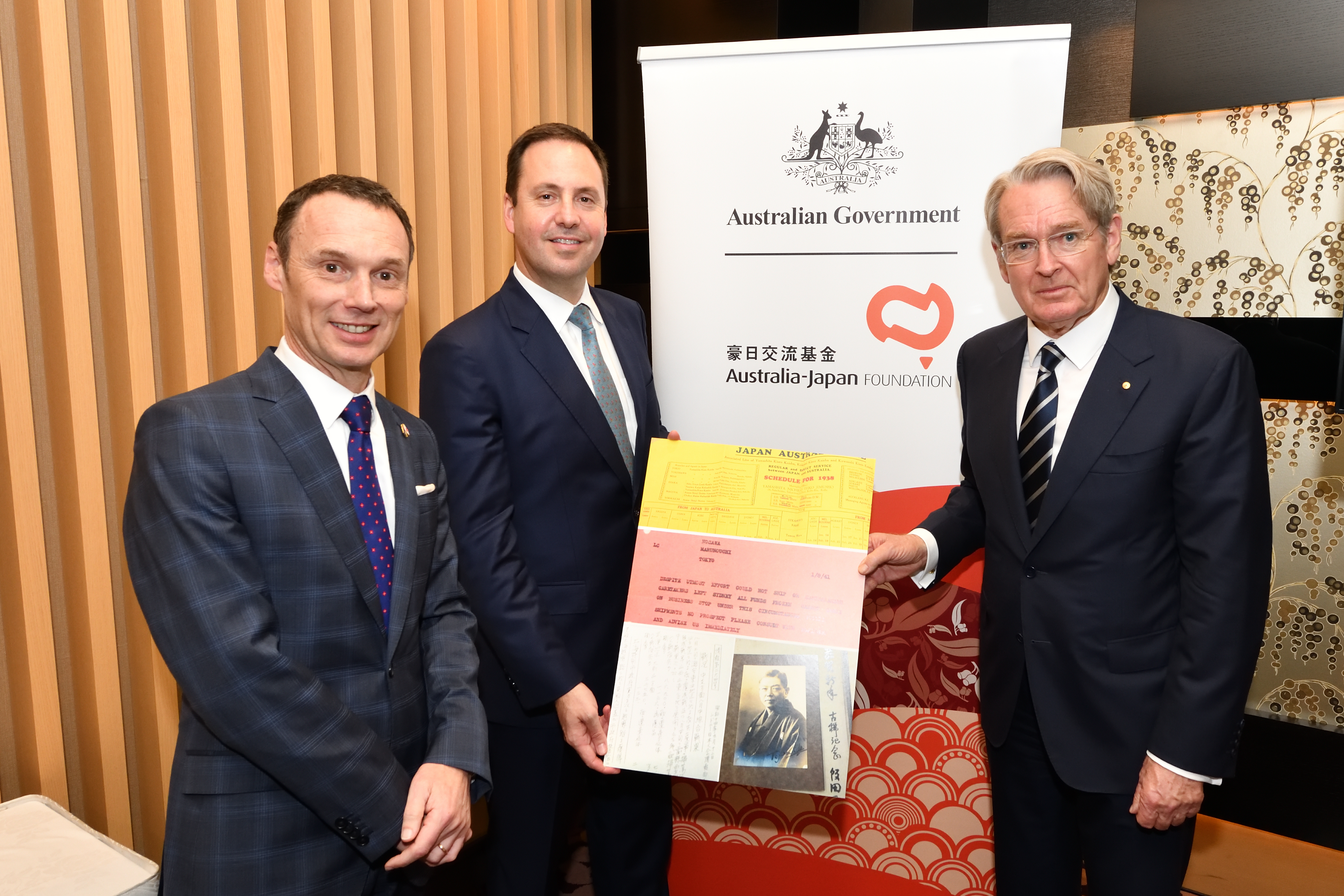 Minister for Trade, Tourism and Investment, Steven Ciobo meets Japanese Foreign Minister, National Archives of Australia (NAA) Director, Mr David Fricker and Ambassador Richard Court AC at a ceremony marking the NAA’s return of Japanese company archives, supported by the Australia-Japan Foundation. Tokyo, 2 July 2018.