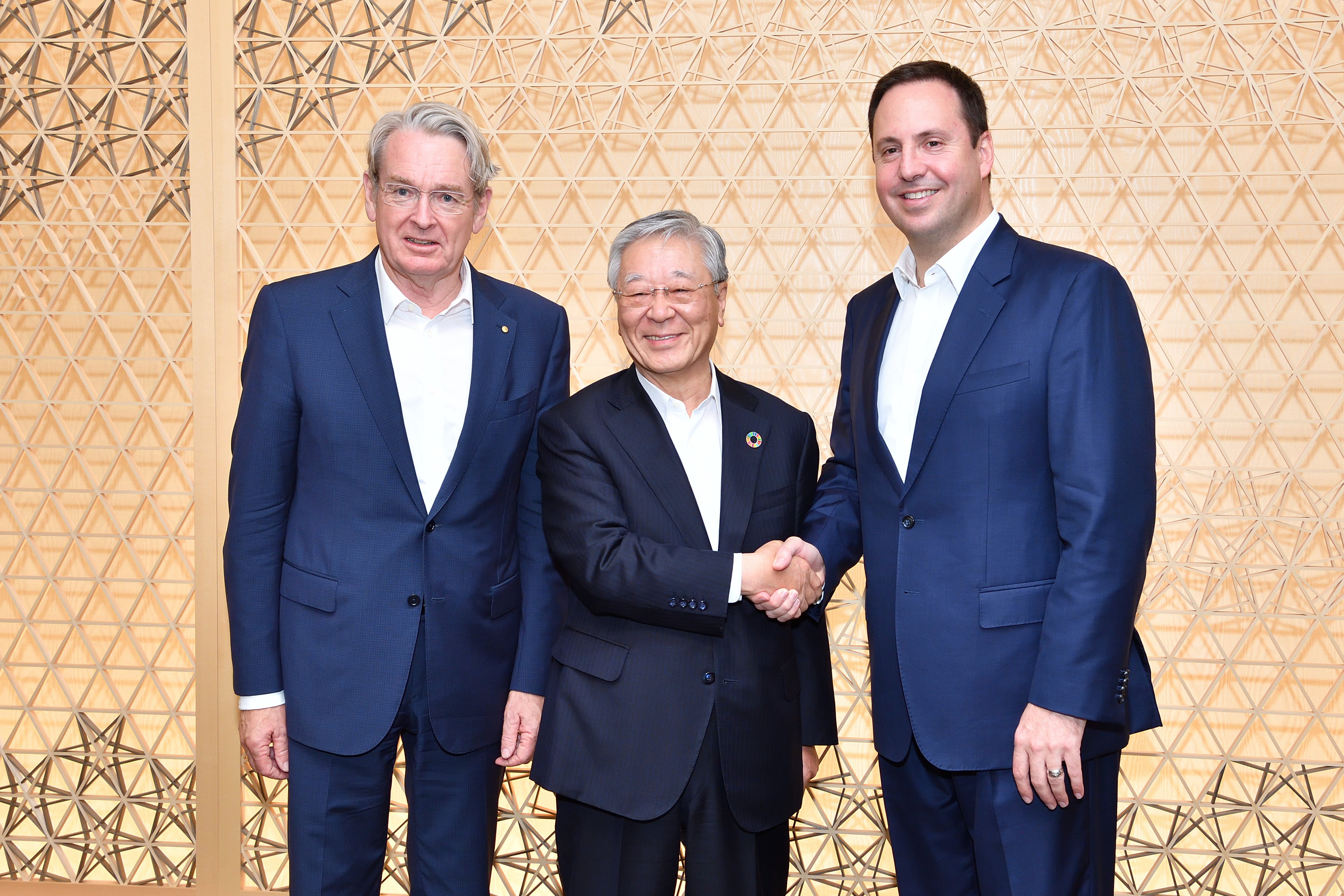 Minister for Trade, Tourism and Investment, Steven Ciobo with Japan Business Federation (Keidanren) Chairman, Mr Hiroaki Nakanishi and Ambassador Richard Court AC at Keidanren Headquarters. Tokyo, 4 July 2018. Credit: DFAT/Ken Katsurayama.