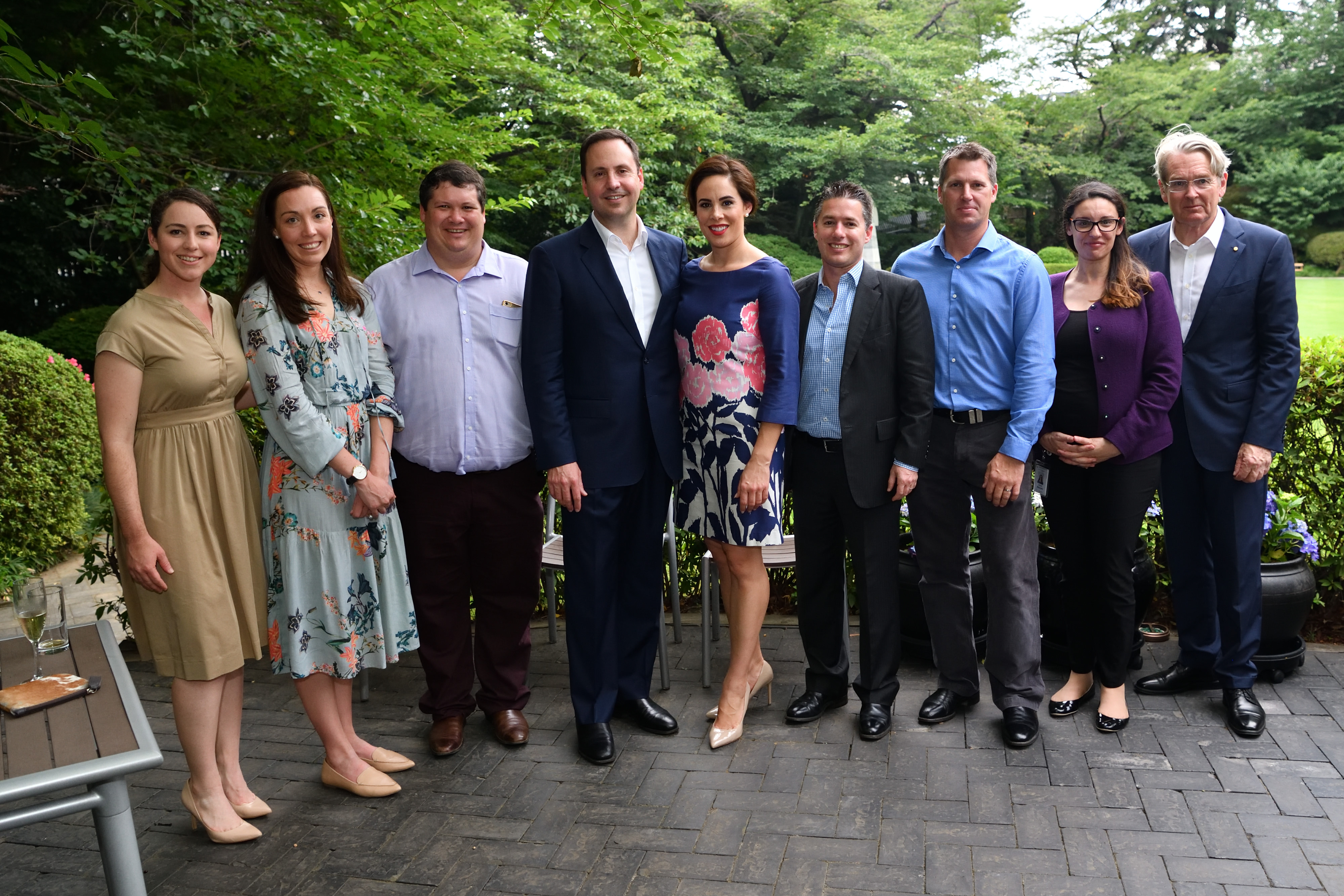 Minister for Trade, Tourism and Investment, Steven Ciobo, Mrs Astra Ciobo, Ambassador Richard Court AC with Counsellor (Agriculture), Ms Nadia Bouhafs and members of the young farmers delegation: Signature Beef General Manager, Ms Tess Camm; Ricegrowers’ Association of Australia rice growers, Mr Michael Chalmers and Ms Rachel Kelly; SunRice Business Development Manager, Mr Rupert Dyer; Graingrowers National Policy Group Member, Mr Kallum Blake. Tokyo, 5 July 2018. Credit: DFAT/Ken Katsurayama.